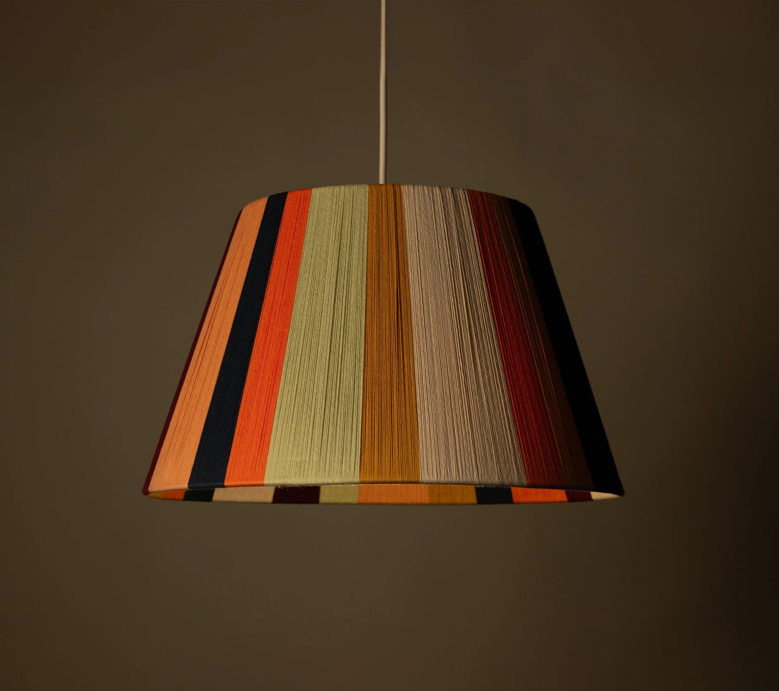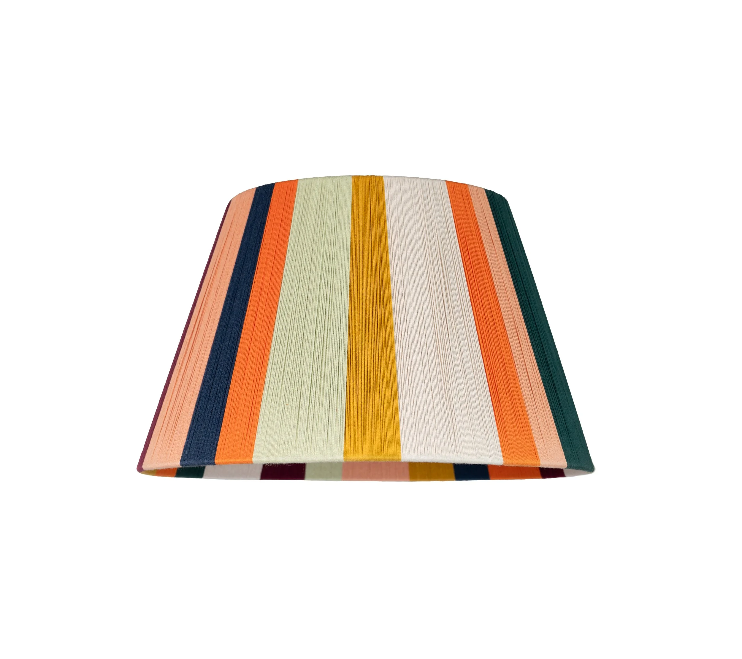 This lampshade is part of the Loving String x Liberty London SS22 archive collection. 'Move Over Rosa' was a ever popular design and celebrates contemporary modern colours. Add an artful layer to your room with this tactile and soothing palette. Chunky sections of Oatmeal, Tangerine, Lolly, Forest, Marigold, Wine and Ink make up this lampshade.