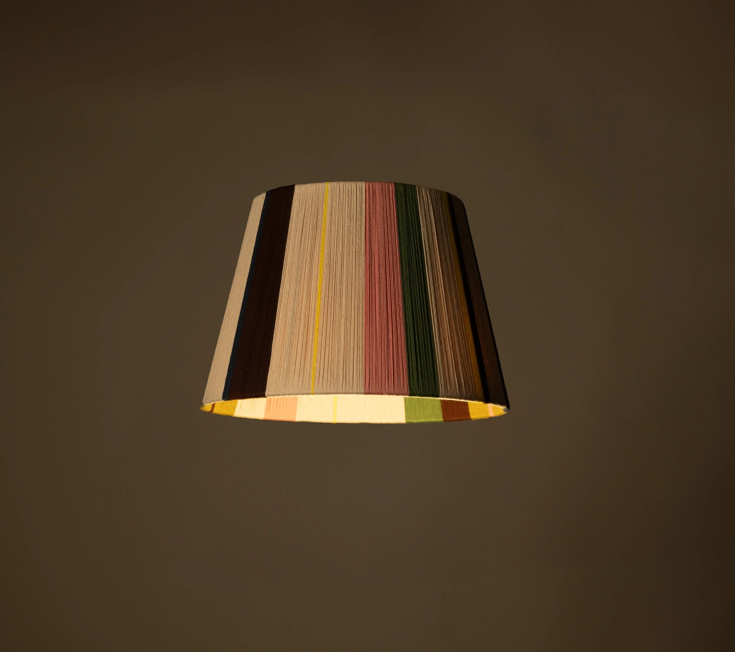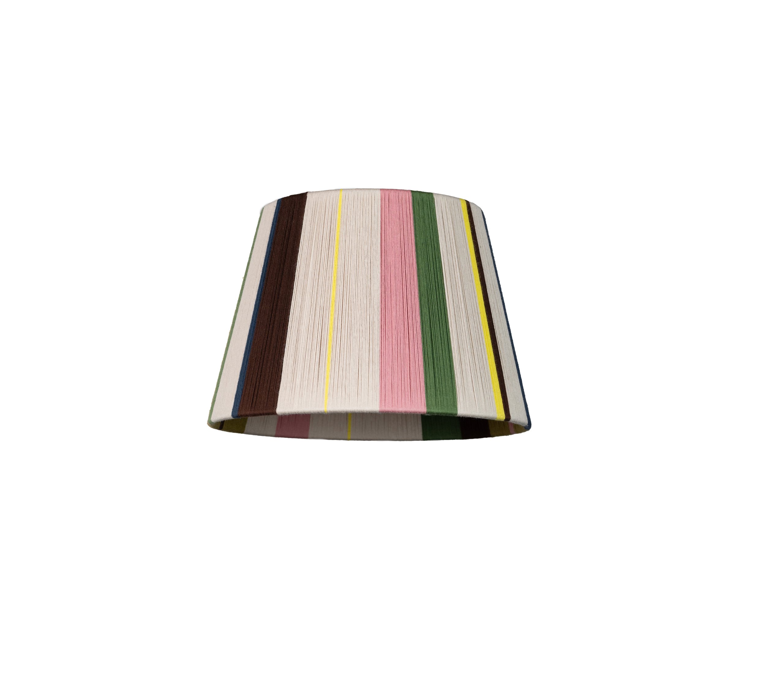 This lampshade is part of the Loving String x Liberty London SS21 archive collection. Best selling 'Stella' made new neutral territory combining a rich brown with a calming oaty tone, to create layers and texture wherever it is placed. It uses Oatmeal, Chestnut, Ink, Dirty, Olive, Percy and pops of Lemon.